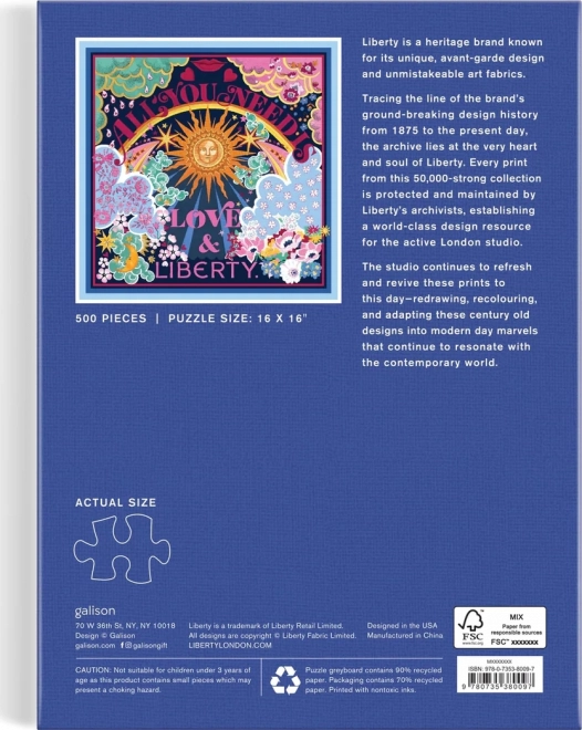 Naše čtvercové puzzle Liberty přináší jedinečnou kombinaci umění a relaxace. S motivem 'Všechno, co potřebuješ, je láska' se ponoříte do světa, kde láska a volnost jsou hlavními tématy. Obal je navržen ve tvaru knihy, což z něj činí nejen puzzle, ale také stylový doplněk do vaší domácnosti.