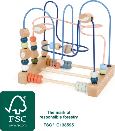 Tento motorický labyrint je vyroben z certifikovaného dřeva FSC® a nabízí dlouhotrvající zábavu dětem. Díky dřevěným korálkům a posuvným prvkům s motivy ledního medvěda, tuleně a sovy sněžné se děti skvěle zabaví, zatímco rozvíjejí svou jemnou motoriku a koordinaci ruka-oko. Počítadla s kroužky přinášejí další možnosti her a učí děti počítání zábavnou formou.