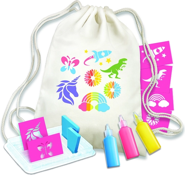 - Batoh se stahovací šňůrkou (27,5 × 36 cm), 3 lahvičky s barvou na textil, 6 lepicích šablon, sada škrabek, stojan na tisk, podrobný návod