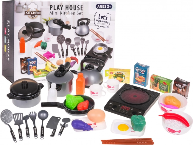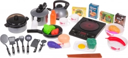 Tato úžasná kuchyňská sada obsahuje vše, co malý kuchař může potřebovat. Indukční sporák, který se napájí třemi AA bateriemi, umožňuje realistické zvuky smažení a vaření, bezpečné plastové prvky jako hrnce, pánve a další příslušenství jsou ideální pro dětskou hru, bez ostrých hran a rizika zranění. Sada obsahuje různé atrapy potravin včetně vajec, ryby a zeleniny, které přidávají na autentičnosti hry.