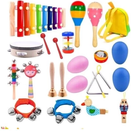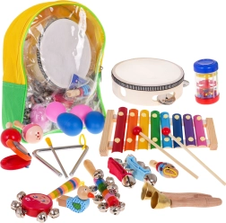 Objevte pestrou dřevěnou hudební sadu pro děti od 2 let s praktickým průhledným batohem. Souprava nabízí 22 pestrobarevných nástrojů včetně xylofonu, tamburíny, marakasů, trikúhelníku, rolniček a vajíček–shakerů. Bezpečné materiály, odolné provedení a spousta zvuků podporují smyslový rozvoj, rytmiku i jemnou motoriku – ideální pro první hudební objevování doma i na cestách.