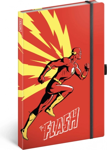 Vibrantní červené desky se žlutými blesky a elastickou páskou podtrhují rychlost a energii superhrdiny – ideální pro stylové poznámky.