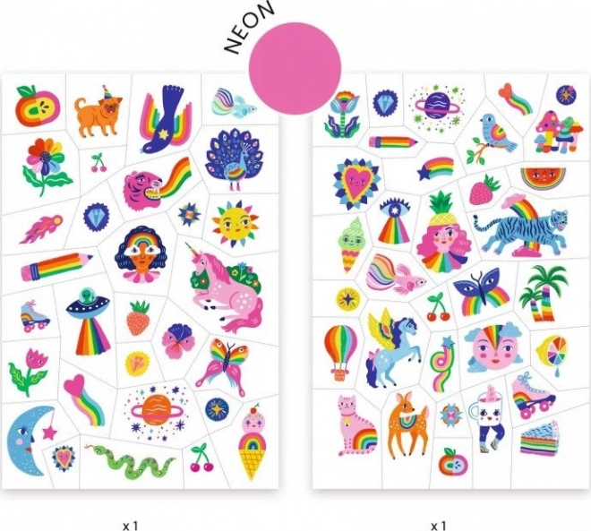 Tetovací balíček DJECO Rainbow přináší pestré barvy a jemné, vkusné ilustrace, které si děti zamilují. Aplikace je blesková – stačí vystřihnout, sloupnout fólii a přitisknout; tetování se okamžitě přenese na kůži bez potřeby vody.