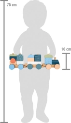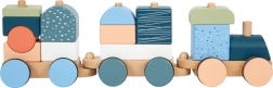 Vláček je zároveň stohovací skládačka – 13 dílů lze zasouvat, kombinovat a používat i samostatně jako stavební kostky.