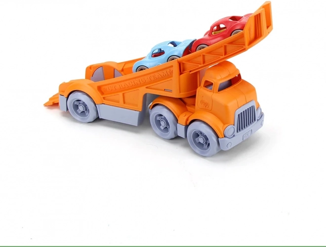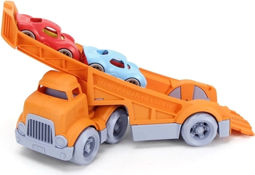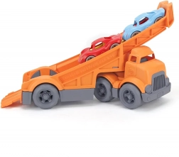 Ekologický dopravní set od Green Toys přináší bezpečnou a zábavnou hru pro nejmenší. Robustní oranžový kamion s dlouhou nájezdovou rampou převáží dvě barevná závodní autíčka. Vyrobeno z recyklovaného plastu z lahví od mléka, bez BPA, ftalátů a PVC, vhodné na doma, pískoviště i do vody. Jednoduchá údržba – lze mýt v myčce.