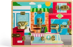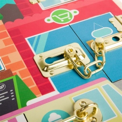 Různorodé mechanismy – překlápěcí západka, závora, panty, řetězový posuvný zámek, západka visacího zámku, otočná západka i háček s okem – pomáhají dětem porozumět běžným domácím uzávěrům a zlepšují přesnost pohybů. Deska je vyrobena z odpovědně získaného dřeva a odolných kovových prvků.
