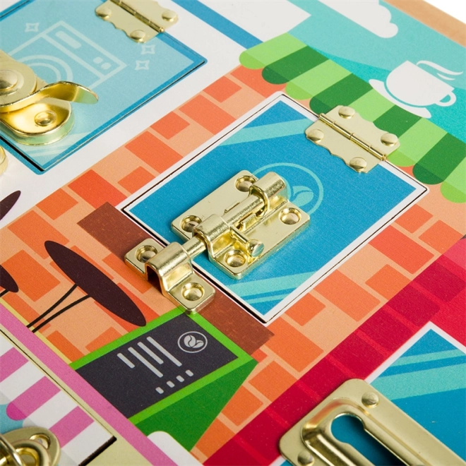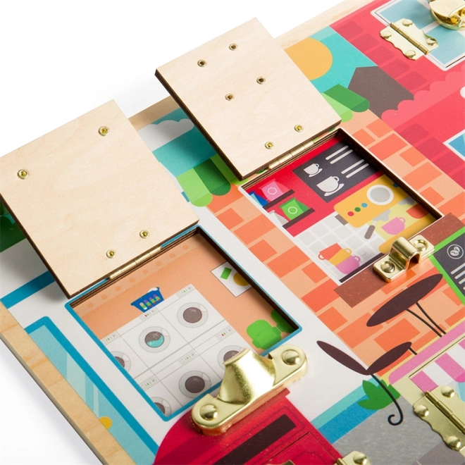 Tato kvalitní dřevěná motorická deska ve stylu Montessori přináší dětem bezpečný prostor k tréninku úchopu, trpělivosti a řešení problémů. Za každými dvířky s jiným typem uzávěru se skrývá barevná scéna (prádelna, kuchyně, kavárna a další), která motivuje k objevování a posiluje představivost.