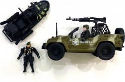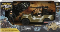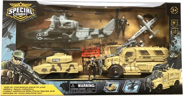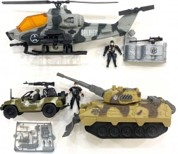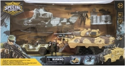Sada obsahuje různé vojenské vozidla včetně terénního auta a tanku, ideální pro průzkumné mise.