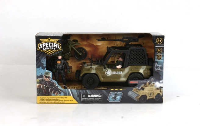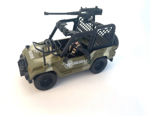Vojenské auto se sadou pro děti od 3 let. Součástí balení je terénní auto, figurka a doplňky pro kreativní hraní.