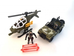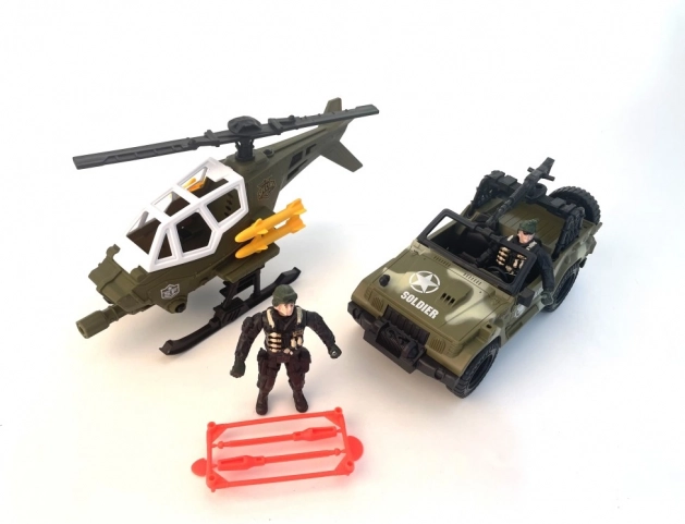 Vojenská sada vozidla a helikoptéry je ideální volbou pro děti, které rády prozkoumávají vojenské prostředí. Tato sada zahrnuje vozidlo, které je připraveno k akci v terénu, a helikoptéru, která vás rychle dostane tam, kam je třeba. Dva figurky vojáků oživí vaši hru skutečným vojenským nasazením.