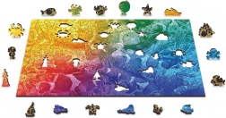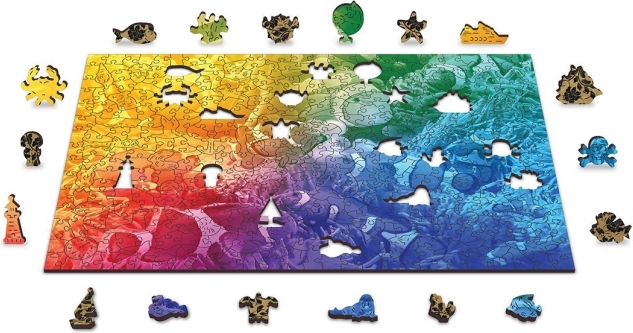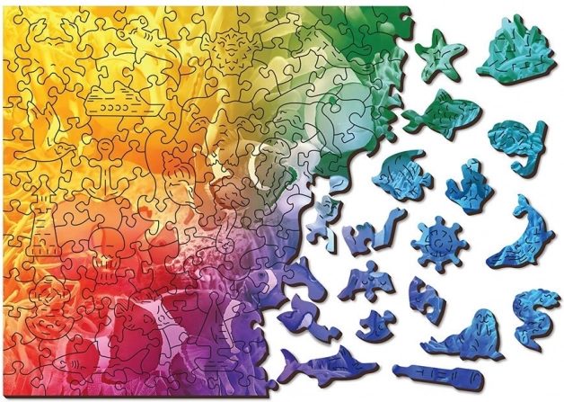 Zažijte pestrý podmořský svět s motivem tropických ryb a zábavou, která jen tak neomrzí. Díky laserem vyřezávaným dílkům a desítkám originálních tvarů čeká na vás chytlavá výzva. Puzzle je oboustranné – z líce skládáte barevný motiv, z rubu opakující se vzor podle tvarů.