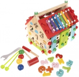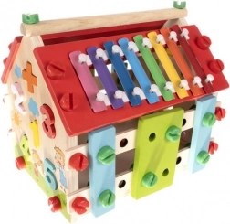 Dřevěný domeček pro děti je multifunkční a edukativní hračka navržená pro rozvoj motorických a kognitivních schopností dětí. Obsahuje různé aktivity, včetně xylofonu a tvarových vkládaček, které zajišťují skvělou zábavu.