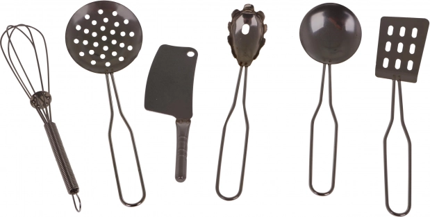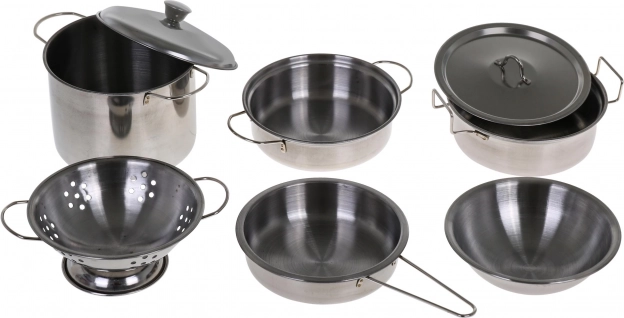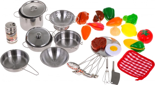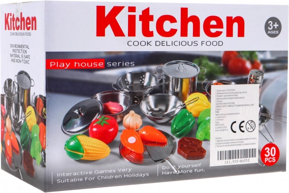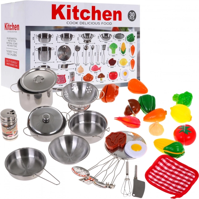 Obsahuje různé kuchyňské nádobí včetně nerezových hrnců, pánví a misek pro realistické hraní.