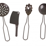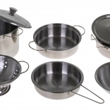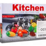 Obsahuje různé kuchyňské nádobí včetně nerezových hrnců, pánví a misek pro realistické hraní.