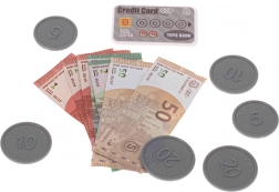 Sada obsahuje různé druhy dětských peněz, kreditní kartu a pestrou škálu zboží, což přidává reálný dojem ze hry na obchod.