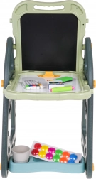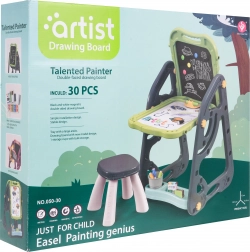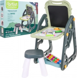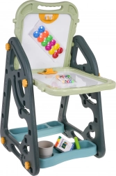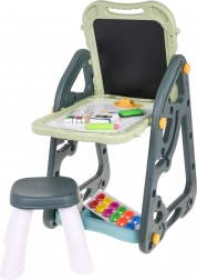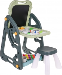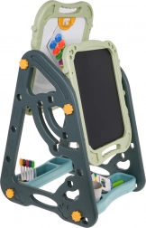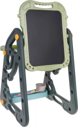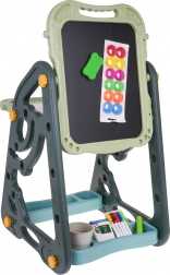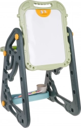 Velký multifunkční set se skládá ze dvou tabulí: křídové a magnetické, spolu s pohodlnou stoličkou, je ideální volbou pro děti od 3 let. Nabízí možnost nastavit tabule do dvou poloh – na jedné straně magnetická, na druhé křídová, nebo jako stolek s plochou pro kreslení. Na bílé straně lze psát fixy nebo připevňovat barevné magnety, zatímco černá strana je určena pro kreslení křídou. Set obsahuje také dvě police na výtvarné potřeby.