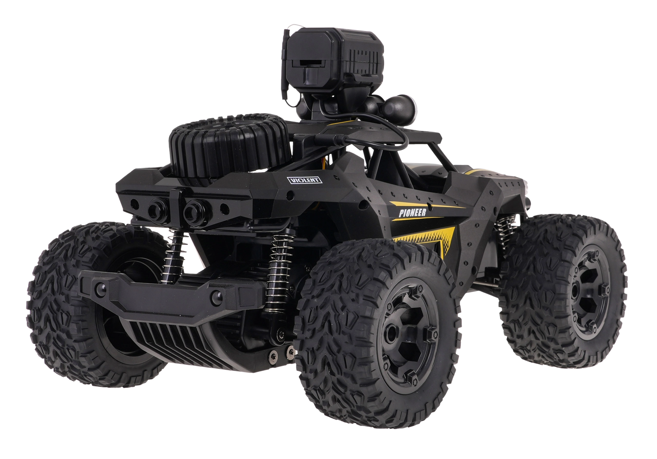 Terénní RC vůz PIONEER s kamerou je stavěný na dobrodružství. Vysoká světlá výška, velké gumové pneumatiky s agresivním vzorkem a účinné tlumiče zajišťují skvělou trakci a stabilitu i na štěrku, trávě nebo hlíně. Kovová karoserie a antikolizní rám chrání auto při nárazech a pádech.