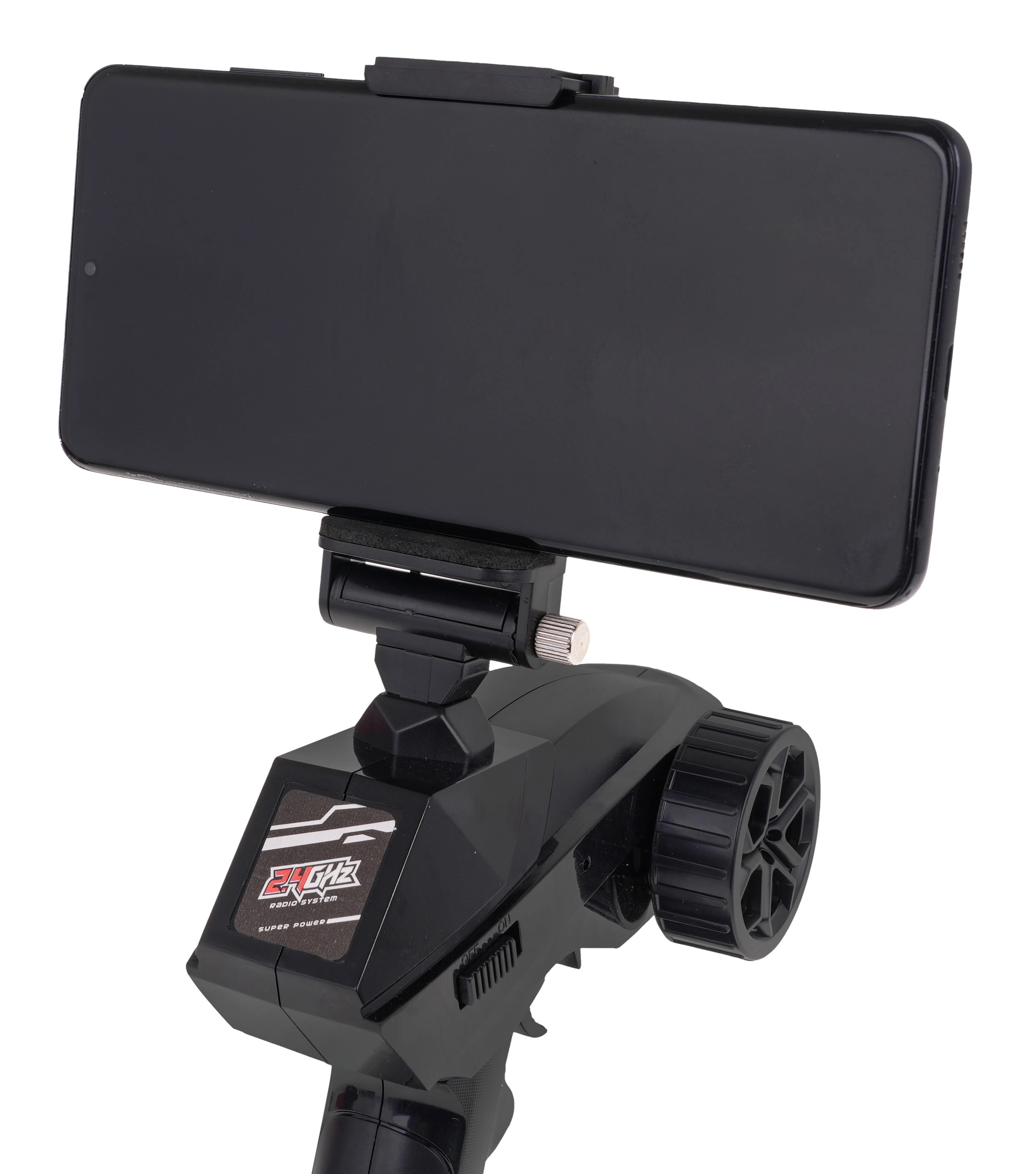 Ergonomický pistolový ovladač s přesným řízením a trimem funguje na 2,4 GHz bez rušení. Integrovaný držák telefonu usnadní sledování záběru z kamery.