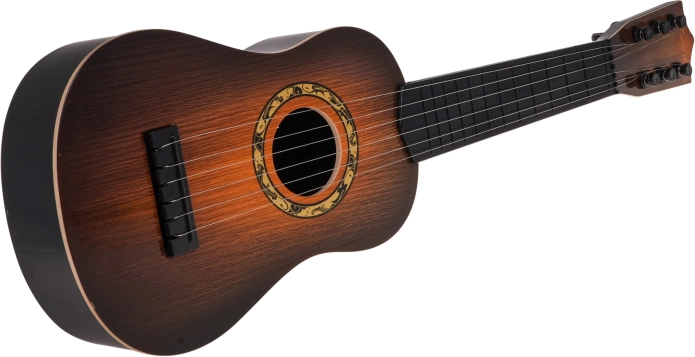 Tato klasická dětská kytara v tmavě hnědém provedení věrně napodobuje skutečný nástroj. Má šest kovových strun a funkční kolíky pro základní ladění, takže dítěti zprostředkuje autentický pocit ze hry a motivuje ho k rozvoji rytmu i sluchu.