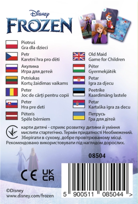 Oblíbená hra Černý Petr v licenci FROZEN potěší všechny fanoušky Anny, Elsy a Olafa. Hráči si rozdají karty, tvoří shodné dvojice a snaží se vyhnout kartě Černý Petr. Jednoduchá pravidla zvládnou i menší děti a jedna partie trvá jen pár minut – ideální na cesty i domácí pohodu.