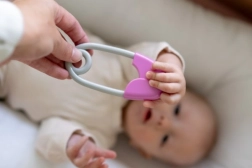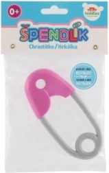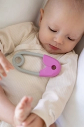 Chrastítko ve tvaru špendlíku je nezbytnou součástí výbavy každého dítěte. Je navrženo tak, aby bylo snadno uchopitelné pro malé ručičky a svou lehkostí nezatěžovalo dětské ruce. Jeho růžovošedé kontrastní barvy zaujmou a podpoří vizuální vnímání. Děti si oblíbí jemné chrastění, které přichází s každým pohybem.