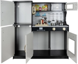 Dětská kuchyňka XL z kvalitního dřeva (MDF) potěší detailním provedením a odolností. LED lampičku lze umístit pod skříňku, do skříňky nebo do trouby, takže si děti užijí atmosféru opravdového vaření i za šera. Otočná tlačítka sporáku vydávají realistické „cvakání“, což ještě více vtáhne do hry.