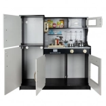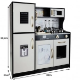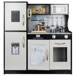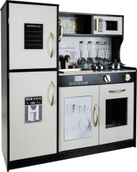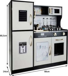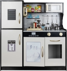 Stylová dřevěná kuchyňka XL od KRUZZEL v kombinaci černé, bílé a zlaté přináší dětem realistickou hru na vaření. Nabízí LED podsvícení, zvukové efekty hořáků, ruchové prvky a bohaté příslušenství zdarma (hrnec, pánev, poklička, 4 lžíce). Vyjímatelný dřez, trouba, mikrovlnka a úložné skříňky na “klik” podpoří kreativitu, učení hrou a rolové hraní.