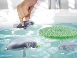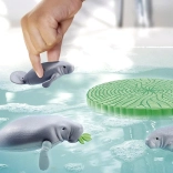 Dospělý manat a dvě mláďata inspirují k péči o zvířata, krmení a pozorování ve vodním prostředí.