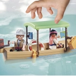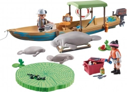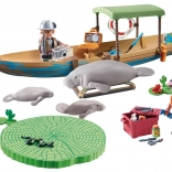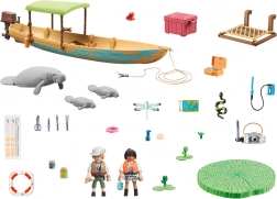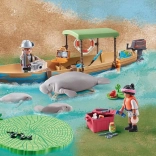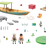 Součástí je člun s přívěsným motorem, záchranným kruhem, nástroji a kamerou, dvě figurky průzkumníků, dospělý manat a dvě mláďata i vodní rostliny. QR karta otevírá vzdělávací obsah pro zábavné učení o zvířatech a jejich prostředí.