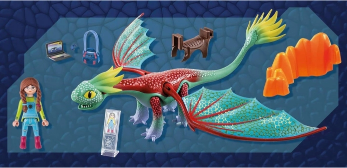 Součástí je figurka Alex (cca 7,5 cm) a velký drak (cca 35 × 36 × 12 cm), ale také praktické doplňky jako sedlo, hologram, laptop, taška, náramkové hodinky a velký krystal. Set podporuje představivost, kreativitu a rozvoj jemné motoriky.