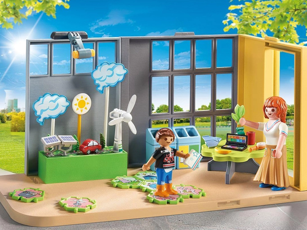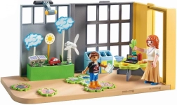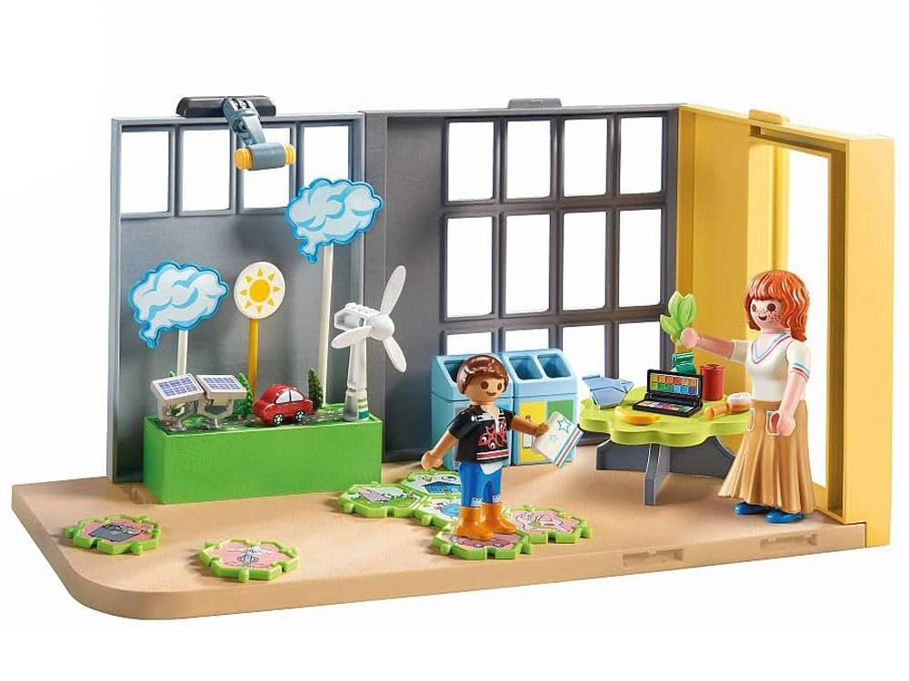 Součástí jsou koše na tříděný odpad, rostliny, ekologické dekorace, prvky „zelené“ infrastruktury i školní vybavení. Set je kompatibilní s dalšími stavebnicemi PLAYMOBIL (např. rozšíření školních tříd), takže jej snadno propojte do většího školního světa.