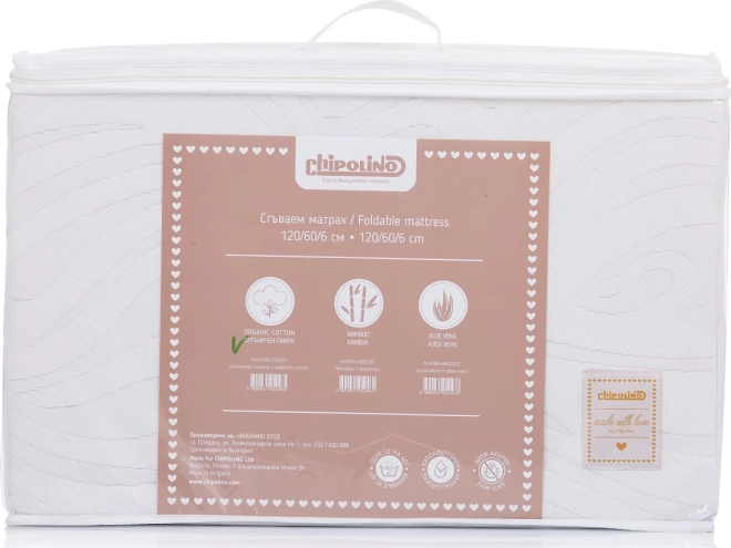 Skládací matrace CHIPOLINO o rozměrech 120 × 60 cm kombinuje přírodní pohodlí a praktičnost. Potah z BIO/organické bavlny je jemný k pokožce, bez pesticidů a škodlivých chemikálií, takže je vhodný i pro citlivé děti a alergiky. Jádro z vysoce kvalitní polyesterové pěny poskytuje vyváženou oporu páteře s dlouhou životností.