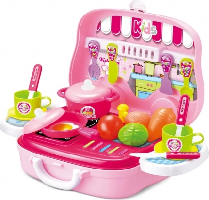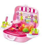 Praktická kuchyňská sada pro malé kuchařky v kufříku ve tvaru autíčka nabízí zábavnou hru s 25 doplňky, které lze snadno rozložit a rozšířit.