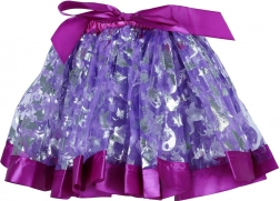 Fialová sukénka s lesklými stříbrnými vzory a pružným pasem se snadno přizpůsobí různým postavám.