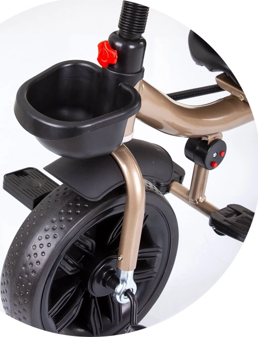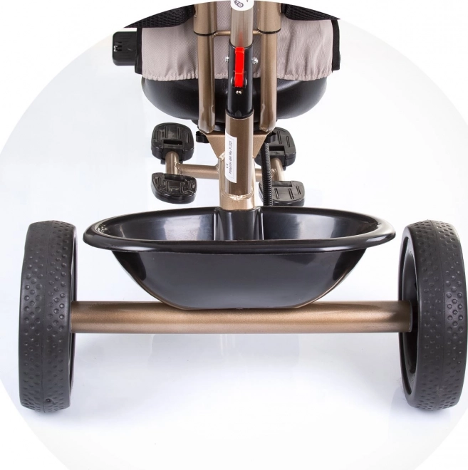 Rodiče ocení ergonomickou rukojeť pro přesné vedení, brzdové pedály na zadních kolech a kryt předního kola, který brání zachycení nožiček. Dvě skládací stříšky se sluneční clonou chrání před sluncem, zatímco praktické koše vpředu i vzadu pojmou vše potřebné na cestu.