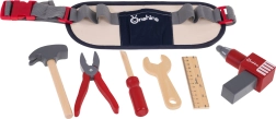 Opasek na nářadí je nastavitelný a uzavíratelný na sponu, obsahuje středovou kapsu a pět přihrádek pro uložení všech nástrojů sady. Děti si tak mohou s radostí hrát na opraváře a rozvíjet svou představivost.