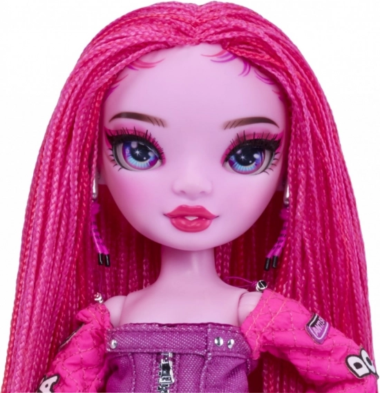 Panenka má živě růžové spletené vlasy, výrazné modré oči a detailní obličejové prvky, které podtrhují její stylový vzhled.