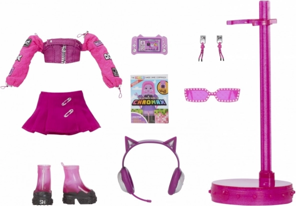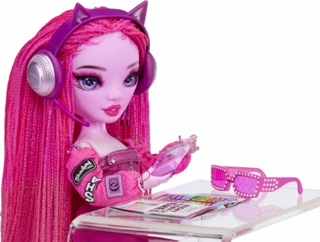 Součástí panenky jsou různé módní doplňky včetně růžových slunečních brýlí, sluchátek s ušima a růžového stojánku, které podporují kreativní hraní a umožňují vytvářet unikátní módní vzhledy.