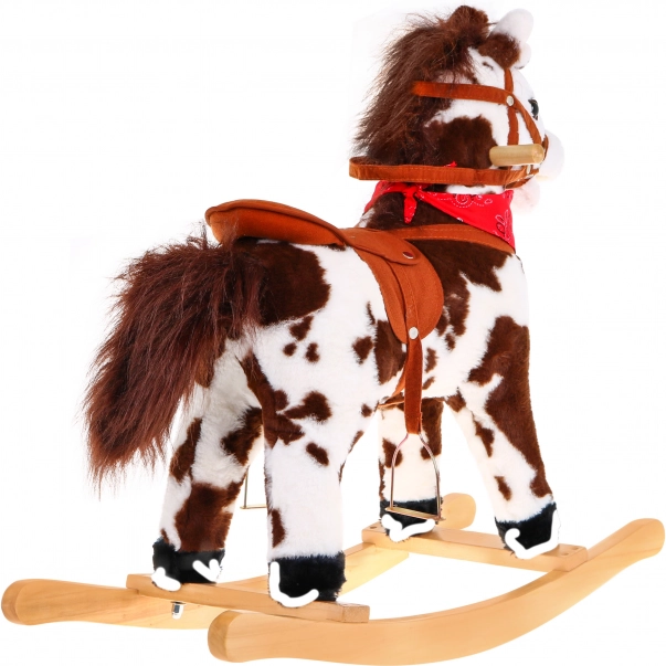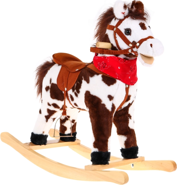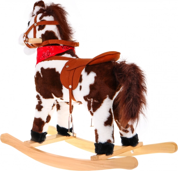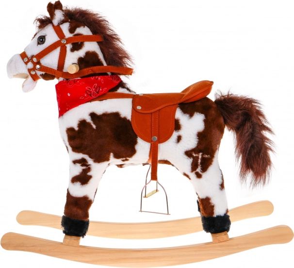 Tento stylový houpací koník v realistickém hnědo-bílém provedení je ideální společník pro malé jezdce. Stabilní dřevěná konstrukce v kombinaci s měkkým plyšovým potahem zajišťuje pohodlí i bezpečí. Díky uchytům ze dřeva a pevným třmenům děti snadno nasednou a užijí si plynulý houpavý pohyb.
