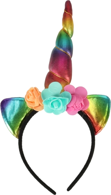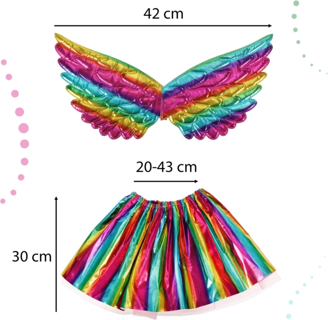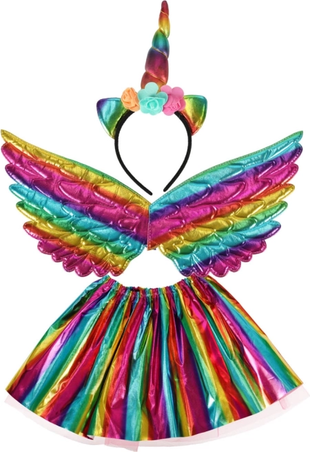 V balení najdete vše potřebné - duhová křídla, čelenku s rohem a sukni, ideální pro jakékoli oslavy.