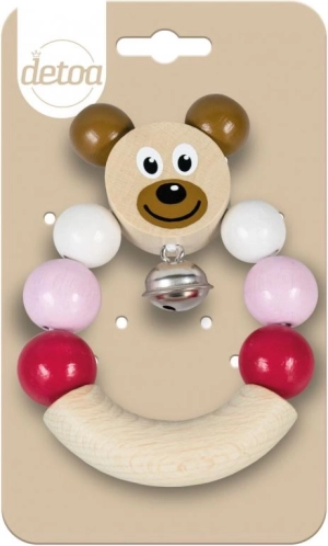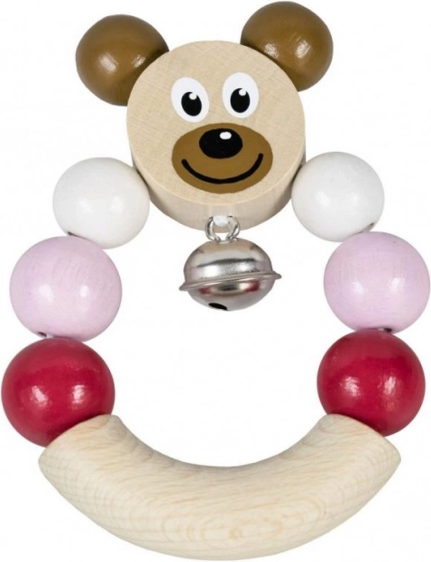 Roztomilé dřevěné chrastítko s motivem medvídka v růžové barvě potěší každé miminko. Je snadno uchopitelné, má nízkou hmotnost a uvnitř ukrytá rolnička jemně cinká pro uklidňující zvuk. Vhodné pro děti od 6 měsíců a dodáváno v eko přírodním balení.