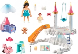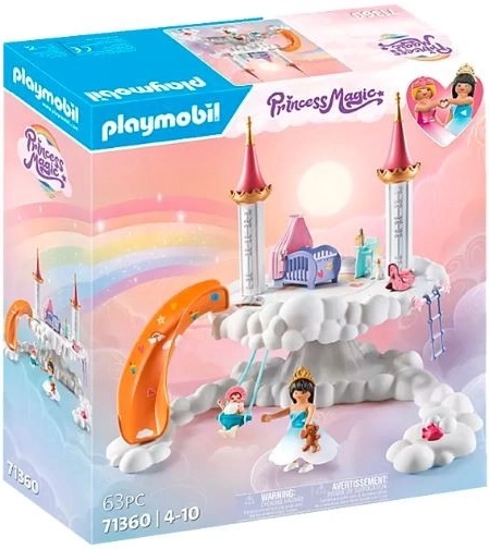 Na nebeském obláčku PLAYMOBIL čeká úžasné, magické dobrodružství. Pod ochranou duhy a světla duhového květu se princezny starají o dobro všech tvorů. Nejmenší obyvatelé království jsou obklopeni kouzelnou péčí: kolébka, houpací kůň, plyšový medvěd, skluzavka a lahodné jídlo, to vše pro zajištění té nejlepší péče.