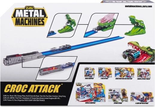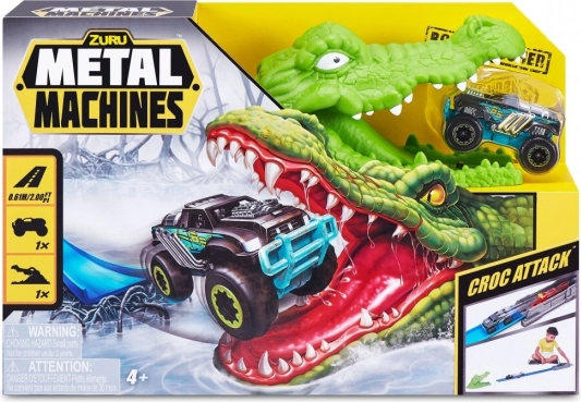 Zuru Metal Machines Krokodýlí útok je autodráha, která vás vtáhne do světa akční zábavy. Vydejte se vstříc nebezpečnému krokodýlovi, který číhá na váš Monster Truck. Dosáhněte dostatečné rychlosti, abyste krokodýlí čelisti překonali v bezpečí.