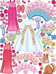 Kolekce samolepek zahrnuje různé módní doplňky jako šaty, klobouky a boty, které umožňují kreativní hraní.
