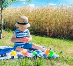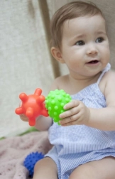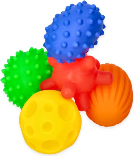 - Různé povrchy pro taktilní stimulaci, snadné uchopení, vhodné ke kutálení a mačkání