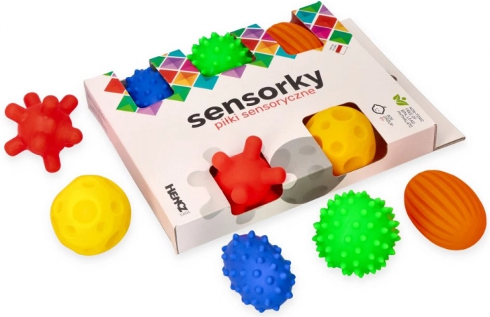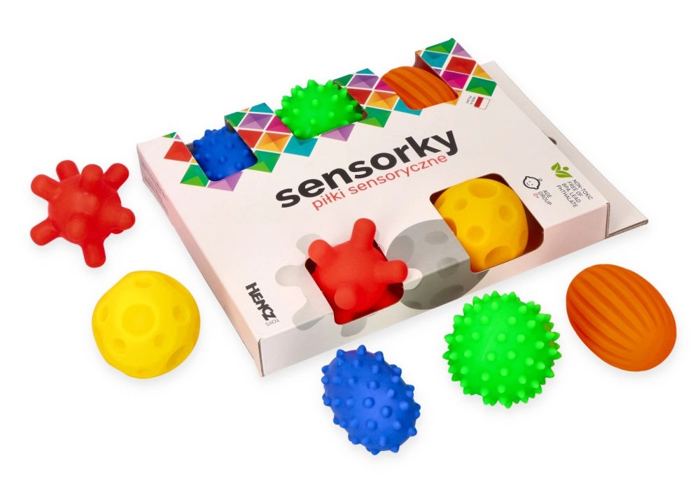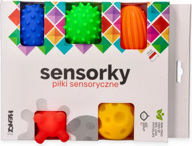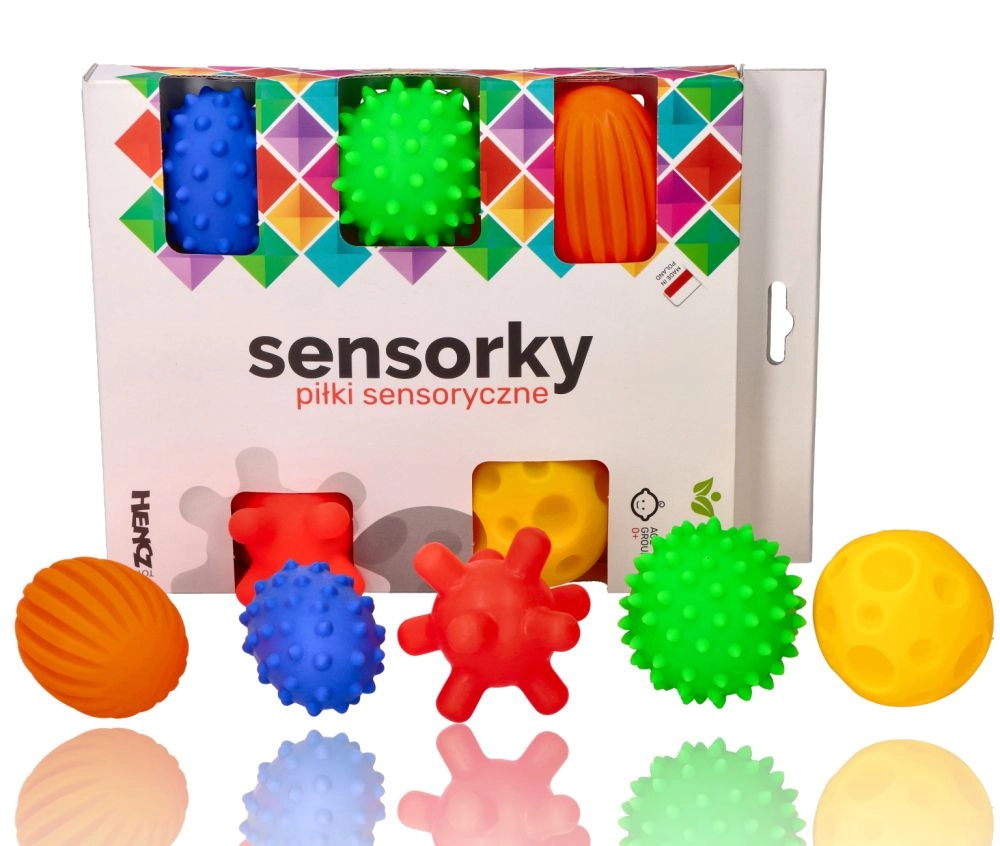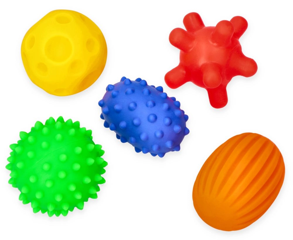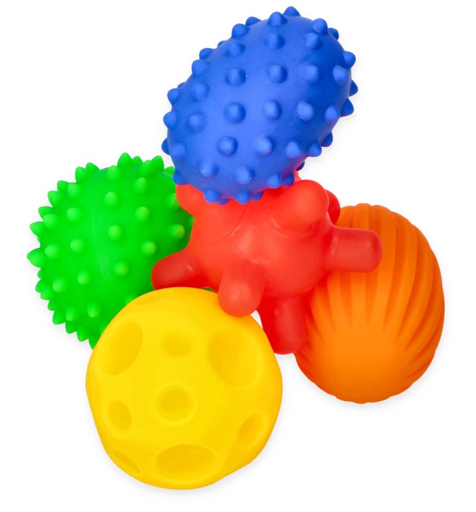 Sada 5 barevných senzorických míčků s výstupky, bodlinkami a rýhováním podporuje vnímání tvarů a povrchů, soustředění i přirozený rozvoj smyslů. Díky měkkému materiálu se míčky snadno uchopují drobnými ručkami, jsou vhodné na hraní doma, na dece i ve vaně.
