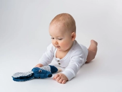 Pískátko a šustící ouška podporují sluch, kontrastní materiály trénují zrak a různé textury rozvíjejí hmat. Barevné štítky motivují k úchopu a procvičují jemnou motoriku.