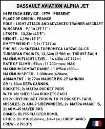 Alpha Jet je lehký útočný a pokročilý výcvikový letoun, který vznikl díky německo-francouzské spolupráci a vstoupil do služby v 70. letech 20. století. Tento kostičkový model byl vytvořen na základě licence francouzského výrobce vojenských letounů Dassault Aviation a doplňuje kolekci modelů Armed Forces v měřítku 1:48.