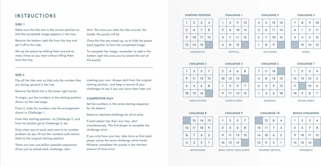 Stačí odejmout jeden dílek a posouváním skládat obraz, nebo otočit všechny dílky a pustit se do číselné hádanky. Čím více dílky promícháte, tím náročnější výzva. Robustní dřevěná konstrukce a kompaktní rozměry jsou ideální na cesty, do kanceláře i domů.