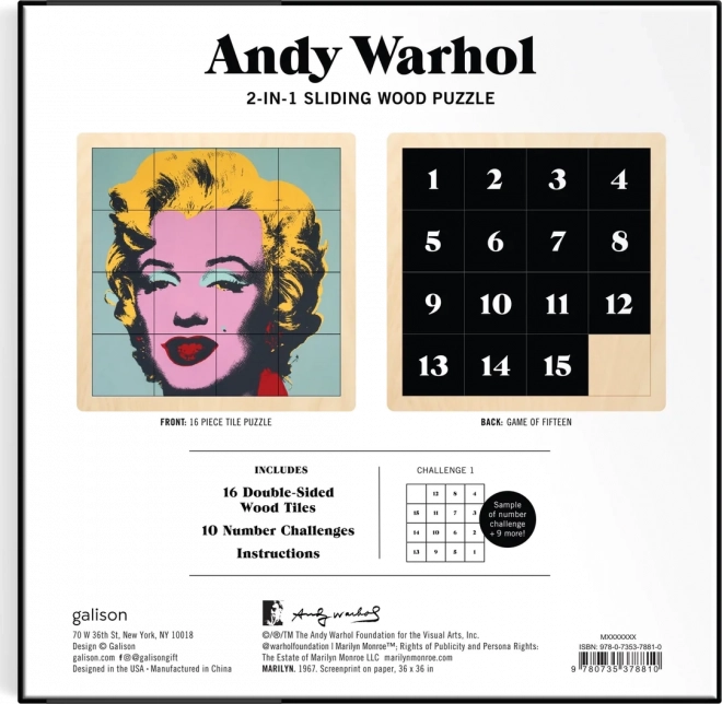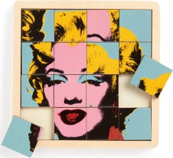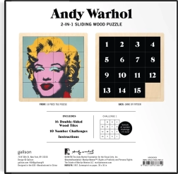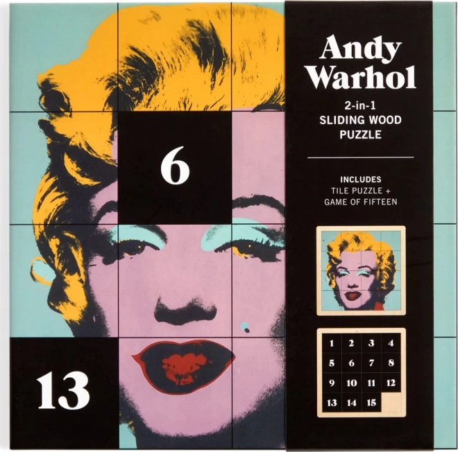 Tato unikátní posuvná dřevěná puzzle poskytnou hodiny zábavy a kreativní výzvy. Na jedné straně naleznete ikonický motiv Andyho Warhola, na druhé pak číselný rébus: Hra o patnáct. Puzzle o velikosti cca 15 x 15 cm je konstruováno tak, aby vyžadovalo soustředění a strategii.